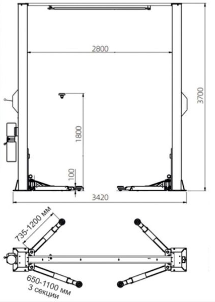 Автомобильный подъемник TU-4000 - заинтересует тех, кому нравиться ровный пол между стойками (отсутствует поперечная перекладина, синхронизация тросовая, через верх).