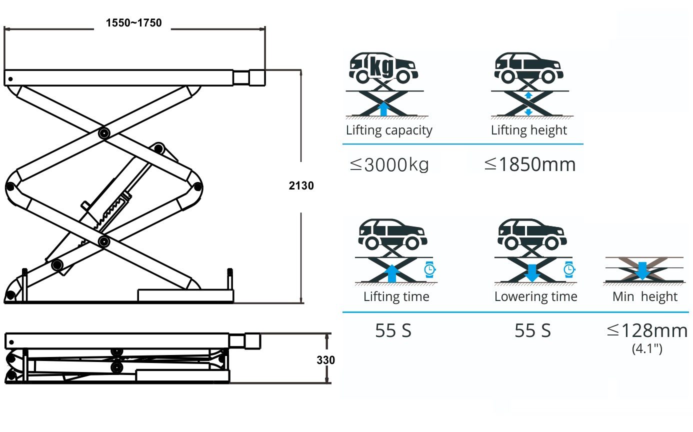 Подъемник ножничный электрогидравлический 3 тонны TS-1104 с заглублением (ровный пол), оборудован пневматическим стопорным механизмом – требуется подключение к пневмолинии. Стойка управления подъемником расположена отдельно. Поставляется на 220/380В