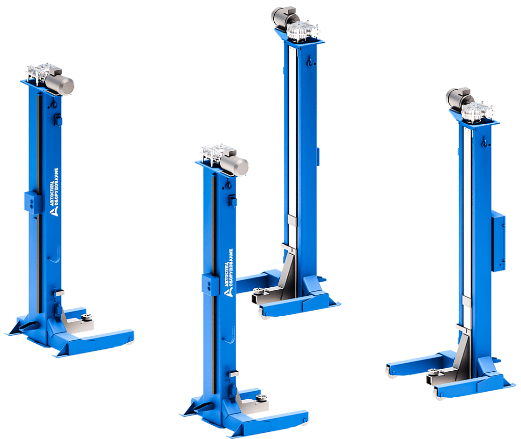Подъёмник передвижной, электромеханический ППТ-16, максимальная г/п 16 т, 4 стойки, червячный редуктор, с концевыми выключателями нажимного действия, ограничивающими ход каретки. Комплектуется двумя страховочными подставками. Предназначен для подъёма безрамных автомобилей (автобусы, троллейбусы, трамваи) за поддомкратные площадки.