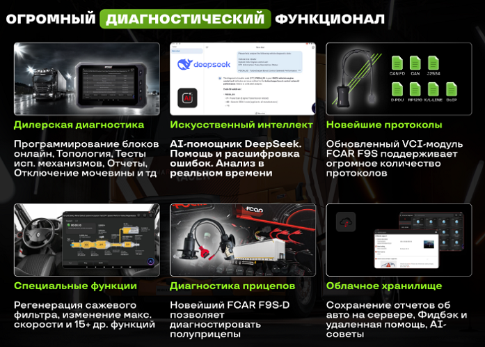 FCAR-F9S-D поддерживает расширенные диагностические операции, включая базовые тесты, специальные проверки и функции уровня дилерских решений — кодирование и программирование блоков. Рабочее меню полностью переведено на русский язык, имеет удобную навигацию, включает графическую визуализацию и электрические схемы. Встроенный интеллектуальный помощник DeepSeek помогает ускорять процесс анализа данных.